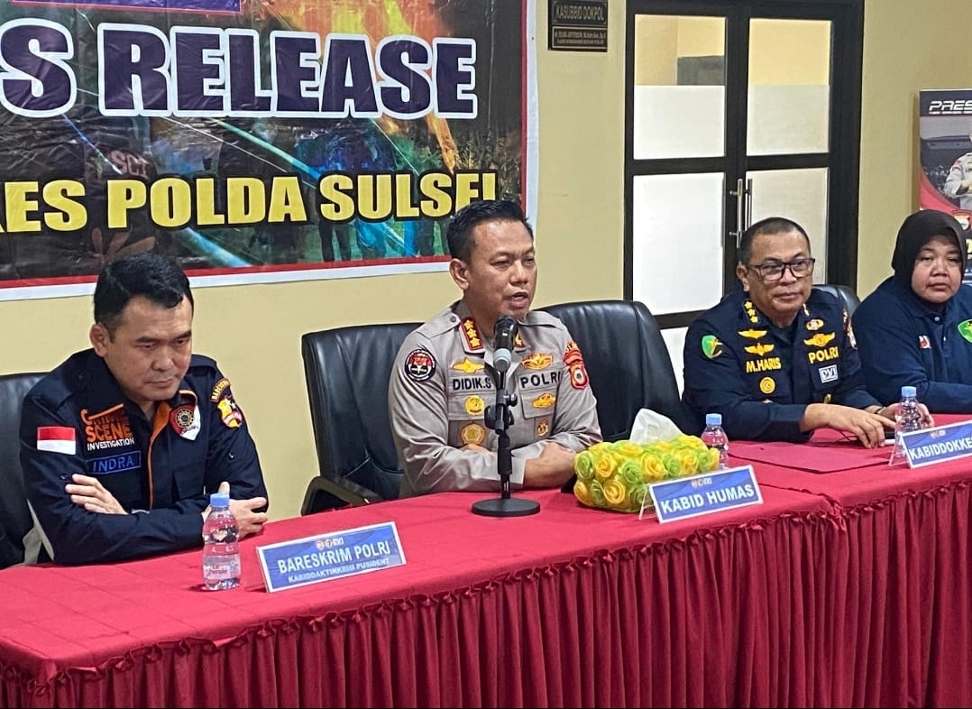 Press release dipimpin oleh Kabid Humas Polda Sulsel Kombes Pol. Didik Supranoto, S.I.K., M.H., bersama Kabiddokkes Polda Sulsel, perwakilan Pusdokkes Polri selaku Kabid DVI, serta Bareskrim Polri melalui Kabiddaktikkrim Pusident.