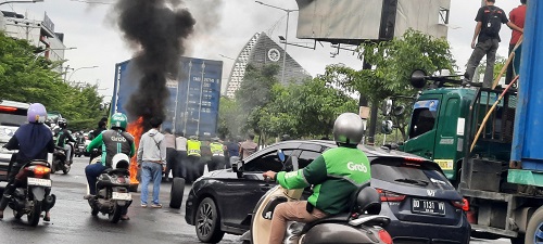 Kanit Samapta Polsek Tamalate, AKP Hasanuddin, S.Sos., yang juga bertindak sebagai Wakil Padal pengamanan unjuk rasa, menjelaskan bahwa salah satu mobil kontainer mengalami mogok tepat di tengah persimpangan sehingga mengganggu arus lalu lintas yang sedang padat.