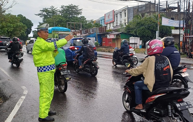 Personel Lantas tampak sigap membantu para pengguna jalan, baik pengendara roda dua maupun roda empat, dengan mengatur arus kendaraan dan memberikan imbauan agar senantiasa mematuhi peraturan lalu lintas.