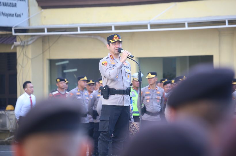 Makassar- Kapolrestabes Makassar Kombes Pol Arya Perdana, SH,SIK,M.Si memimpin apel jam pimpinan yang digelar di halaman apel Polrestabes Makassar, Senin (06/04/2024).
