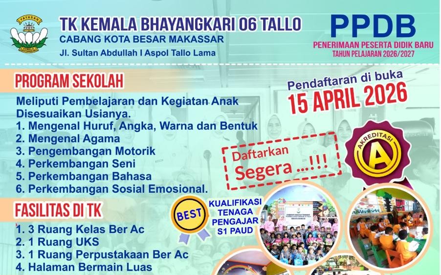 Makassar — TK Kemala Bhayangkari 06 Tallo resmi membuka Penerimaan Peserta Didik Baru (PPDB) untuk Tahun Pelajaran 2026/2027. Pendaftaran telah dibuka sejak 15 April 2026 dan ditujukan bagi anak usia 4 hingga 5 tahun.